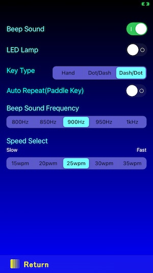 電鍵の切り替えやモールス変換のパラメータは”Setting”から設定します。